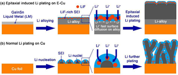 图5.外延诱导电镀锂的概念。(a)E-Cu上Li合金化和外延诱导电镀行为的图解。(b)Cu表面Li形核和电镀行为的图解。