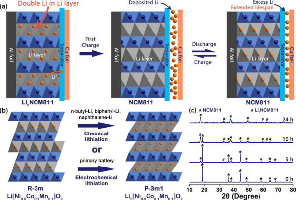 图2.基于Li2NCM811正极的无负极锂金属电池的概念。(a)Li2NCM811在无负极锂金属电池中工作原理示意图。(b)Li2NCM811的制备方法。(c)Li2NCM811的XRD图样。