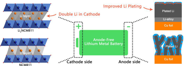 图1.分别从正极、负极侧改善无负极锂金属电池循环寿命示策略意图。