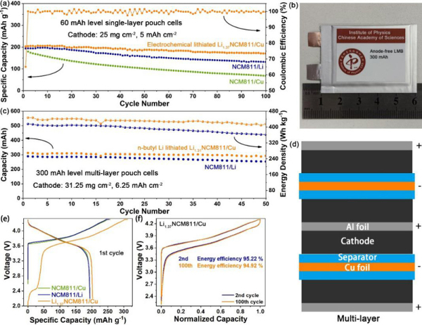 图3.Li2NCM811材料在无负极软包电池中电化学性能展示。(a)单层软包电池性能对比。(b)多层软包电池照片。(c)多层软包电池性能对比。(d)多层软包电池结构示意图。(e)单层软包电池首次充放电曲线对比。(f)第2次循环与第100次循环能量效率对比。