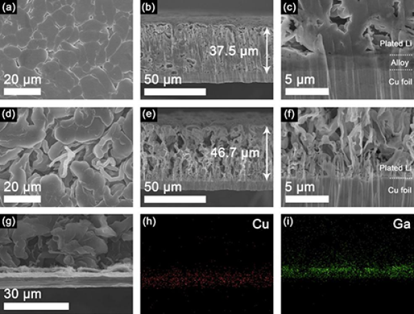 图7.E-Cu和Cu集流体上的镀锂行为。在0.5mA cm-2电流密度下电镀5mAhcm-2锂后E-Cu集流体的(a)SEM图像和(b)、(c)横截面扫描电镜图像。在0.5mA cm-2电流密度下电镀5mAhcm-2锂后Cu集流体。(d)SEM图像和(e)、(f)横截面扫描电镜图像。在0.5mA cm-2电流密度下电镀5mAhcm-2锂后E-Cu集流体的(g)S横截面扫描电镜图像及相应的(h)Cu和(j)Ga EDS元素分布图。