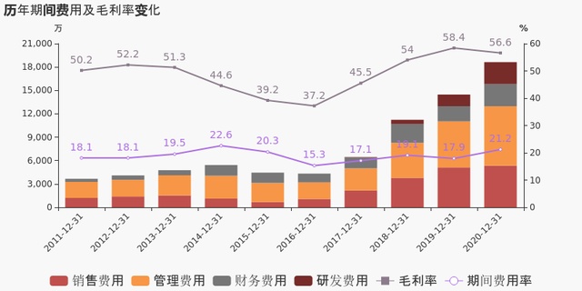 公司2020年营业成本3.8亿,同比增长13.5%,高于营业收入8.7%的增速,导致毛利率下降1.8%。期间费用率为21.2%,较上年升高3.3%,对公司业绩形成拖累。