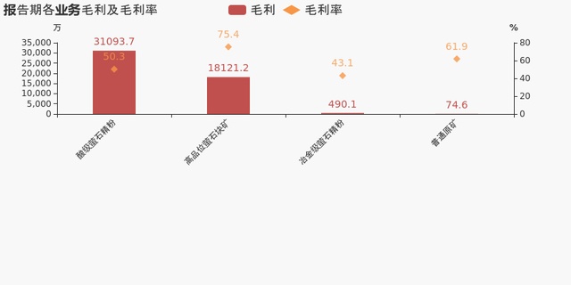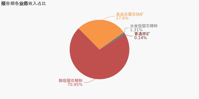 从业务结构来看,“酸级萤石精粉”是企业营业收入的主要来源。具体而言,“酸级萤石精粉”营业收入为6.2亿,营收占比为71%,毛利率为50.3%。