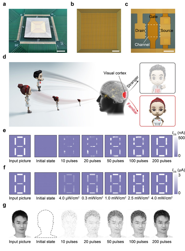 图3.碳纳米管-量子点神经形态人工视觉光电传感器。a、人工视觉芯片外观图(标尺,5 mm);b、1024像素传感器阵列光学照片(标尺,0.5 mm);c、单元像素的光学照片(标尺,20 μm); d、人类视觉皮层针对不同人脸形成的差异性印象的示意图;e、初始状态以及在10、20、50、100和200个光脉冲训练后数字“8”突触权重结果。其中,激光波长405nm,激光功率密度1 μW/cm2,光脉冲宽度250 ms,脉冲间隔250 ms;f、初始状态以及在4.0 μW/cm2、0.3 mW/cm2、1.0 mW/cm2、2.5 mW/cm2和4.0 mW/cm2功率密度下训练10个光脉冲后数字“8”的突触权重结果。其中,激光波长405 nm,光脉冲宽度250 ms,脉冲间隔250ms;g. 人类面部(论文第一作者)的识别训练过程模拟