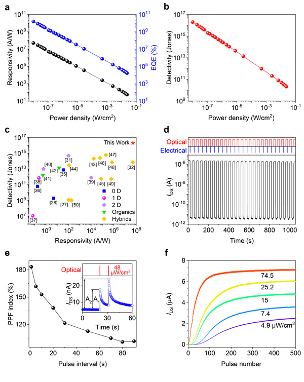 图2. 光电响应与神经突触特性。a、响应度、外量子效率与激光功率密度关系,其中响应度高达5.1×107 A/W; b、探测度与激光功率密度关系,其中探测度高达2×1016 Jones;c、基于不同类别材料的器件响应度-探测度综合性能对比;d、光学和电学激励下的器件开关响应特性,其中信噪比大于>105;e、人工神经突触的双脉冲易化(PPF)性能;f、人工神经突触的长程增强现象