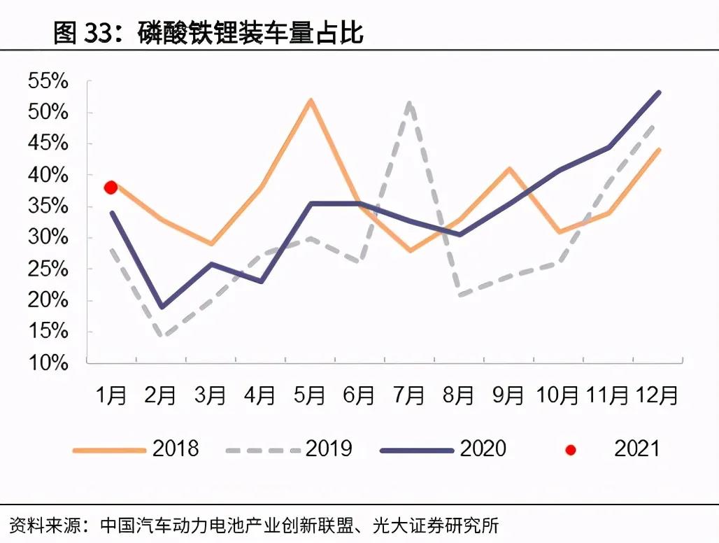 3月11日,中汽协在汽车行业信息发布会上透露,2021年1—2月磷酸铁锂电池产量累计9.5GWh,占总产量44.3%,同比累计增长624.2%。其中2月磷酸铁锂电池的装车量为2.2GWh,同比直接暴增2826%。