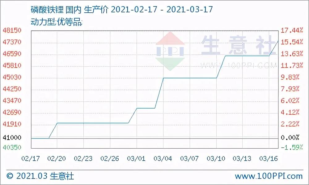 3月17日国内动力型优等品磷酸铁锂均价在47500元/吨,较上月同期上涨15.85%,较上周同期上涨5.56%。而在从11月至今的短短四个月中,价格上涨幅度更是超过40%。