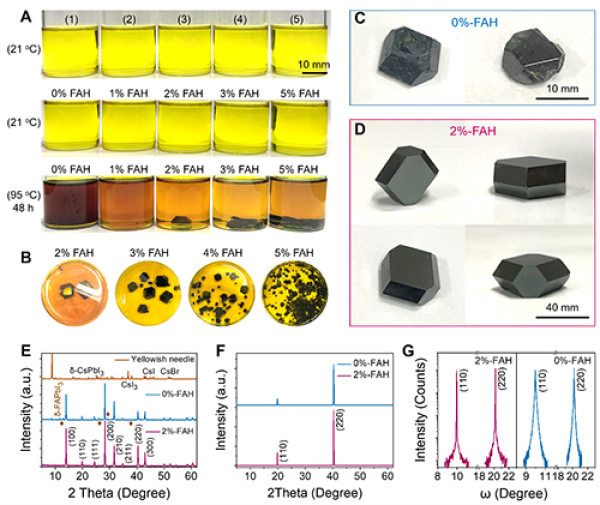 在FAPbI3钙钛矿中掺入铯离子、甲胺离子和溴离子,可以形成多阳离子及多卤素离子的钙钛矿(FAMACs),这种结构的钙钛矿目前被证明是高效的光伏光电器件的最佳组成,因为其相对稳定,离子迁移小,能够有效降低器件中的迟滞现象,具有更高器件稳定性。然而,不同研究团队报道的基于FAMACs的高性能器件中,几种离子的组成和比例不尽相同,尤其是铯离子的相对含量。此外,这种多成分钙钛矿在结晶过程中易出现相分离而形成黄色的非钙钛矿相,该成分的存在将会形成缺陷俘获或散射中心,从而影响器件性能。