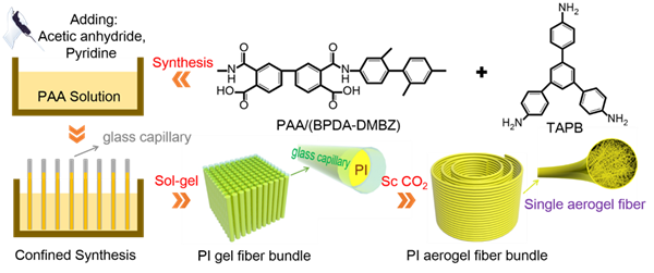 图1.通过溶胶-凝胶限域转变策略制备PI气凝胶纤维的流程示意图