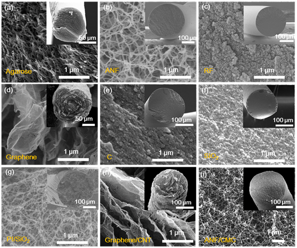 图3.通过SGCT策略制备不同种类的气凝胶纤维扫描电镜照片(a)琼脂糖气凝胶纤维;(b)芳香聚酰胺气凝胶纤维;(c)间苯二酚-甲醛气凝胶纤维;(d)石墨烯气凝胶纤维;(e)碳气凝胶纤维;(f)氧化硅气凝胶纤维;(g)聚酰亚胺/氧化硅杂化气凝胶纤维;(h)石墨烯/碳纳米管杂化气凝胶纤维;(i)芳香聚酰胺/羟甲基纤维素杂化气凝胶纤维。