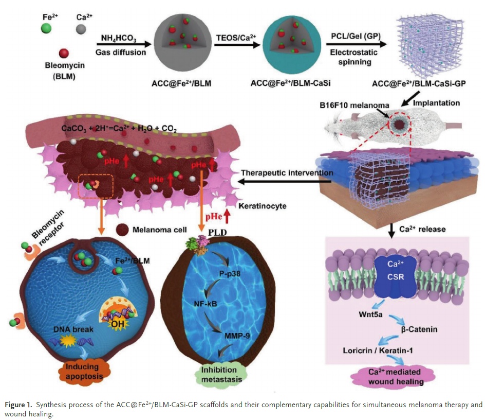 【文章亮点】:作者通过将具有临床药物博莱霉素(BLM)、结合其活性激发因子Fe2+离子,一起通过气相扩散的方法,封装在ACC中,既赋予了药物缓释的能力,又保证了Fe2+离子不被提前氧化。更近一步,结合ACC活泼的表面性质,将其沉积在电纺丝明胶/聚己内酯(GP)纳米纤维上,构筑出一种可生物吸收的复合支架。在应用到黑色素瘤切除后的伤口处时,ACC可以调节伤口处的pH,降低其酸性,以此来提高药物的抗肿瘤活性。并且,ACC这种钙基材料还可以刺激伤口加速愈合。这种结合纳米碳酸钙载体和支架构筑的肿瘤术后治疗新材料,为敷料材料领域的发展提供了新的思路。