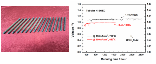 经过多年的研究积累,研究团队已具备从材料到器件的基础研究和工程化开发能力,建立了管式电解池的研制和测试平台,实验室小批量制备的电池衰减率可达0.4%/1000 h(满足5年以上使用寿命),集成的多管电堆已稳定运行11000 h以上,是目前该体系公开报道的最长运行纪录。目前,研究团队正在推进该项电解水蒸气系统耦合可再生能源制取“绿氢”的示范工程。
