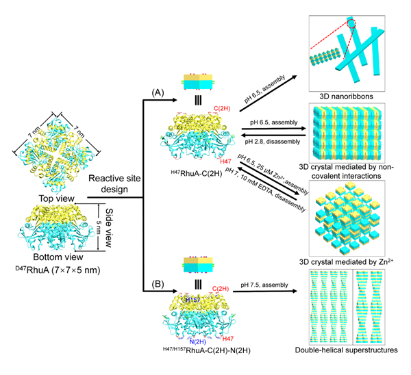 3D纳米带、3D蛋白质晶体和双螺旋蛋白质超结构形成的示意图。(A)设计H47RhuA-C(2H) 变体,在非共价相互作用的介导下自组装形成3D纳米带和两种类型3D晶体结构;(B)设计H47/H157RhuA-C(2H)-N(2H) 变体,在非共价相互作用介导下自组装形成双螺旋3D超结构