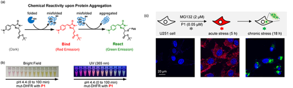 近日,中国科学院大连化学物理研究所蛋白质折叠化学生物学创新特区研究组研究员刘宇团队和生物分子高效分离与表征研究组研究员张丽华团队合作,通过发展新型仿生荧光共价键探针和质谱表征方法,发现蛋白质聚集态界面具有化学反应活性,可用于相变蛋白质的标记与成像。