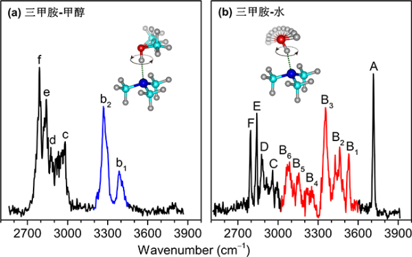 氢键是雾霾颗粒物、分子自组装、生物体系等主要分子间作用力。氢原子质量轻,本质上是波动的,这对确定结构、性能和反应机理等方面起着关键作用。由于三甲胺分子的氮原子孤对电子可以与水和甲醇等溶剂分子形成较强的氢键,三甲胺团簇的研究备受关注。1962年,D. J. Millen等人使用傅里叶红外光谱仪测得了三甲胺-甲醇的红外光谱,发现了一个较宽的OH伸缩振动峰,但由于该红外吸收光谱的分辨率低,溶剂分子在氢键波动中起着什么样的作用、什么样的分子运动引发了如此之大的氢键波动等关键科学问题仍没有答案。
