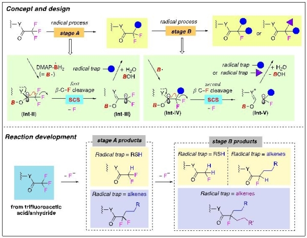 中国科学技术大学教授汪义丰团队和合作者发展了一种三氟甲基逐级可控脱氟官能团化反应。该反应从廉价易得的三氟乙酸衍生物出发,通过spin-center shift的过程,选择性切断一个和两个碳-氟键,然后转化为结构多样的功能性双氟和单氟产物。北京时间3月5日,《科学》以“First Release”形式在线发布了该研究成果。