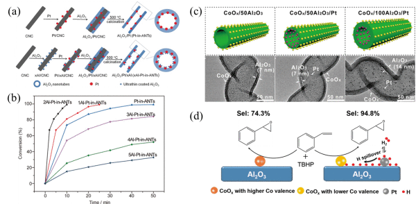 将金属组分与氧化物组分进行空间分离,有助于阐明其作用机制。对于分离的双组分催化剂,在纳米尺寸内变化其距离可能导致不同的溢流行为。科研人员利用ALD精准调控双组分分离催化剂的距离,通过设计一系列单组份催化剂(TiO2/Pt)、紧密接触的双组份催化剂(CoOxPt/TiO2)、双组分空间分离的催化剂(CoOx/TiO2/Pt)及选择性覆盖某一组分的催化剂(CoOx/TiO2/Pt/TiO2和Al2O3/CoOx/TiO2/Pt),研究氢溢流促进的双组份催化剂协同效应。此外,进一步提出利用氢溢流原位精准调控催化活性中心电子结构的新方法,提高了催化剂对于环氧化反应的选择性。利用模板辅助的ALD方法制备了Pt和CoOx纳米颗粒空间分离的CoOx/yAl2O3/Pt催化剂(y为ALD循环数)。从Pt到CoOx氢溢流的量可以通过改变Al2O3的厚度进行精准调控。对于CoOx催化的苯乙烯环氧化反应,反应体系中引入氢溢流(Pt和H2),大幅提高了环氧选择性。选择性的提高是由于可控氢溢流的引入导致反应中的钴物种处于更低的氧化态(图1c-d)。