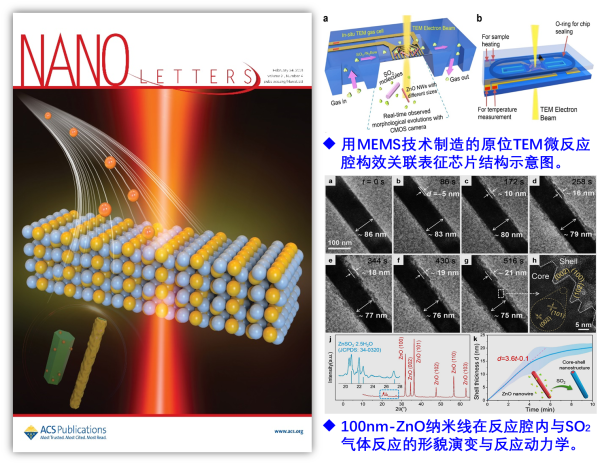 该研究采用原位TEM技术实时观察了两种不用尺度ZnO纳米线在SO2气氛下的形貌演变,表明小尺度ZnO纳米线在反应过程中会形成核鞘结构,而较大尺度的ZnO纳米线则没有明显变化。进一步使用该课题组独创的谐振悬臂梁变温微称重法提取了两种ZnO纳米线与SO2作用的焓变值,用定量结果揭示了两种纳米线间存在显著活性差异的热力学原因,提出了ZnO纳米线与SO2反应的构效关系。研究人员用球差校正电镜深入分析了两种样品的原子级差距,观测到小尺度样品的晶格膨胀,进一步证实了其活性提高的合理性。在原位TEM表征所揭示的构效关系指导下,进一步探索了用不同尺度ZnO纳米线对SO2分别进行捕捉禁锢和传感检测的应用。该研究为纳米材料的优化设计和评估提供了新方法。