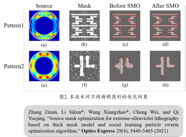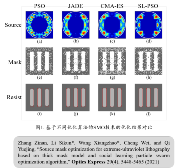 SMO技术是一种重要的计算光刻技术,通过同时优化光源和掩模图形来提高光刻成像质量。上海光机所研究人员针对极紫外光刻,提出了一种基于厚掩模模型和SL-PSO算法的SMO技术。研究人员将基于结构分解的极紫外光刻厚掩模快速模型应用于像素化掩模图形的成像仿真中,和薄掩模模型相比,其提高了光刻成像仿真的精度,且掩模图形的优化结果得到了严格电磁场仿真的验证。采用SL-PSO算法,优化光源和掩模图形;通过社会学习的策略提高了优化效率。通过控制初始化参数来调整SL-PSO算法中的初始化粒子群,在提高优化效率的同时提高了优化后掩模图形的可制造性。研究人员对多个掩模图形进行了验证,仿真结果表明,该技术的优化效率优于国际上常见的基于启发式算法的SMO技术。