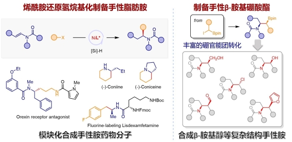 手性胺是重要的手性助剂以及医药、天然产物的关键合成中间体。2019年零售额前200名的药物中,超过三成都含有手性胺结构。高效、便捷合成手性胺化合物是有机合成化学研究的重要方向。常规催化合成手段,如亚胺/烯胺氢化、亚胺烷基化、烯烃氢胺化等,在双烷基取代手性脂肪胺合成中存在底物结构局限。