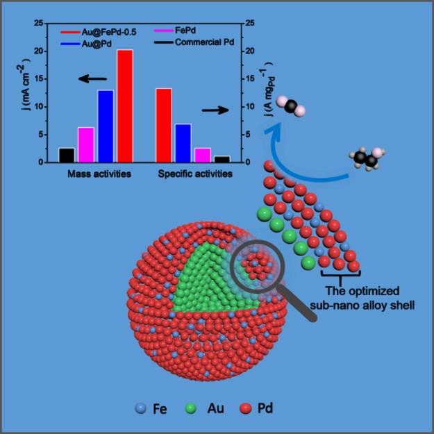研究团队在油胺中合成了具有以Au为核,以FePd合金为亚纳米壳层的核壳结构Au@FePd颗粒。具体来说,由于Au和Pd电负性的差异,钯原子的电子结构会发生改变。此外Pd壳层较薄,Au核引起Pd层的晶格膨胀比较明显,这会增强CO等中间产物在催化剂表面的吸附,毒化催化剂的活性位点。而薄壳层中的Fe组分缓解了Pd晶格膨胀现象,使活性组分Pd具有合适的d带中心,有利于乙醇的电催化氧化。在碱性电解质中,当Fe/Pd原子比为0.5/1时,乙醇电催化氧化的活性最高,质量活性为13.3 A mg-1,面积活性为20.2 mA cm-2,均为目前报道的最高值。理论分析也表明,Au@FePd催化剂中的Fe原子可在较低过电位下,更加稳定地吸附OH物种,促进Pd上吸附的CO物种进一步氧化,强调了通过综合优化催化剂几何结构和表面组成从而合成高性能电催化剂的概念。