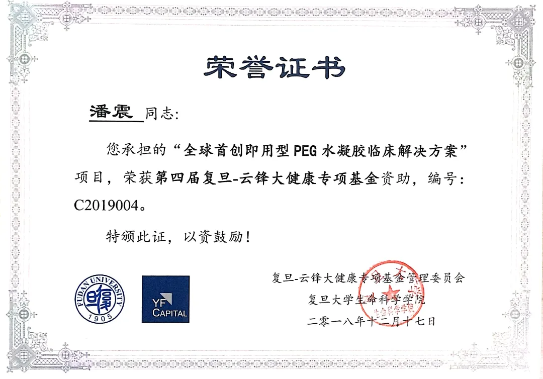 瑞凝生物创始人兼董事长潘震是复旦大学博士,并在美国密歇根大学顶级生物医用材料课题组有过研究学习经历,创立瑞凝生物前曾在世界500强企业美国杜邦公司担任技术专家。潘震博士和瑞凝副总经理陈亮博士均毕业于复旦大学高分子科学系,瑞凝生物作为复旦校友创办企业,项目曾获第四届复旦-云锋大健康专项基金资助。潘震博士表示:“感谢复旦-云锋大健康专项基金在项目早期阶段的资助,也感谢复旦大学创新创业学院老师们一直以来的关心和支持,这无疑是在资本寒冬中对瑞凝团队的雪中送炭。同时,我们也特别感谢本轮投资人领衔健康对我们的青睐,领衔健康是一家非常专业的投资机构,吴家璐先生在医疗大健康领域有过不少的经典投资案例,领衔健康的加入,将有力的帮助瑞凝生物在医用水凝胶领域快速做大做强,我们期待与领衔健康一同结伴同行、乘风破浪。瑞凝生物团队希望学以致用,将十余年积累所开发的可降解PEG水凝胶应用于临床肿瘤的放疗治疗,产品有望颠覆传统肿瘤放疗模式,为肿瘤的临床治疗带来全新的方法。未来,瑞凝生物将在水凝胶和肿瘤治疗领域持续发力,以期国产化的可降解水凝胶产品有效降低临床肿瘤治疗的费用,解决看病贵的社会问题,帮助和造福广大患者。”