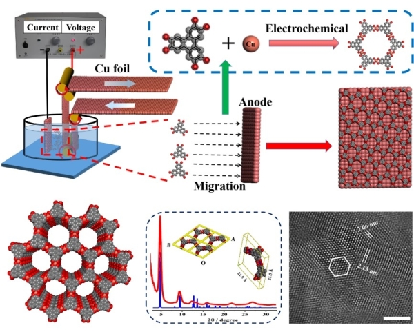 近日,该研究团队提出了一种电荷诱导机制,并利用电化学法在单晶铜表面上制备了大面积均匀的Cu3(HHTP)2、Cu3(BTPA)2、Cu2(MTCP)和Cu3(TBTC)2 MOF薄膜。该方法通过施加外电压使配体离子向阳极迁移并与解离出的Cu2+发生配位反应。经过低电压诱导成核及外延生长后,高质量的MOF薄膜可以直接沉积到铜阳极表面上。在此基础上,研究利用聚甲基丙烯酸甲酯转移技术实现了MOF薄膜从铜箔表面向任意衬底转移。该薄膜具有高的晶体质量,电导可以达到0.087 S cm-1,相比于文献报道提高了三个数量级。