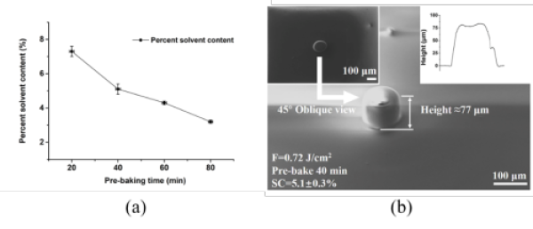 图1.(a)增加预烘烤时间以降低SU-8中的溶剂含量;(b)长焦距、单脉冲曝光的扁平化MPP产物的正、侧视图及其高度信息
