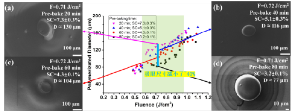 课题组通过解析多光子聚合中的光-物理-化学反应过程,认为光刻胶中引发剂浓度与聚合反应持续时间有关,并将最终影响聚合产物的极限尺寸。科研人员选择的光引发剂是六氟锑酸盐小分子,单体是双酚A型环氧树脂大分子的SU-8光刻胶,通过烘烤改变光引发剂的浓度,研究光引发剂在光刻胶中扩散行为对最终聚合极限尺寸的影响规律。此外,通过利用长焦距、单次飞秒脉冲曝光方法获得了扁平化聚合物,精确表征了聚合物尺寸,发现当SU-8胶膜的溶剂含量从~7%下降到4%时,MPP产物的尺寸减小了~40%。这种聚合尺寸优化源于溶剂含量减少导致的光致阳离子扩散能力减弱,从而使聚合反应被约束在更小的尺度范围内。