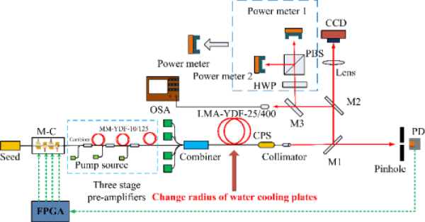 该研究中,研究人员对主放大器的增益光纤进行盘绕限模优化,增加除LP01和LP11以外的高阶模的损耗,实现1.4 kW窄线宽少模激光输出;以高功率光纤激光器输出的LP01和LP11模式的强度分布特征为基础,通过探测光斑的中心光强变化作为系统的评价函数,以区分不同模式。利用高速可编程门阵列(FPGA)以实现SPGA算法,产生4路反馈控制电压信号,并将其加载到模式控制器上。模式控制器中的压电陶瓷(PZT)对预放光纤产生挤压和应力,改变光纤中各种横向模式的配比。当这些模式注入主放大器,利用放大器的模式竞争特性,实现不同横模模式的受控功率放大。当SPGD算法收敛到最大值时,激光器输出LP01模式激光;当SPGD算法收敛到最小值时,激光器输出LP11模式激光。通过对红外相机采集到的光强分布进行模式解构处理,研究人员得出两种情况下产生的LP01模式的光光效率为84.1%,LP11模式的光光效率为85.8%以上,两种模式切换的转换效率大于99.5%。该研究产生的1.4 kW的横模可控光纤激光在光镊技术、原子捕获、激光微加工等领域具有应用价值。此外,宽带宽的主动模式控制系统对以后开展光纤激光器模式不稳定研究提供了有利条件。