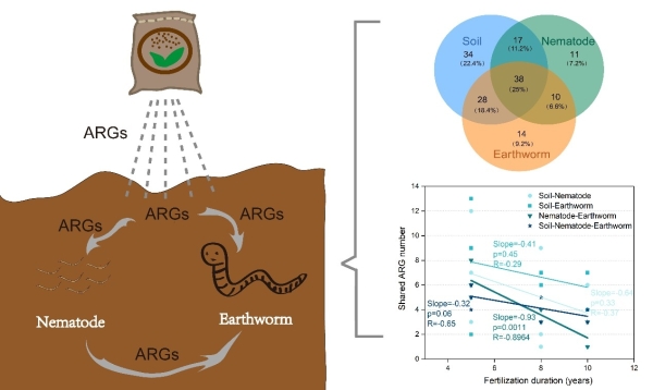 中国科学院城市环境研究所城市与健康重点实验室研究员朱永官研究组通过一个长期施肥的农田监测点,探讨不同施肥时间和施肥方式对于土壤微生物、线虫和蚯蚓肠道微生物中ARGs的影响。研究表明,ARGs在线虫和蚯蚓肠道微生物中的命运不同,前者较后者有更高的富集水平;施肥方式显著影响了土壤中ARGs的数量和丰度,施肥时间则明显改变了ARGs的组成;研究进一步通过微生物溯源分析和共享ARGs数据构建了ARGs在土壤-线虫-蚯蚓中的迁移网络;而ARGs随着时间而消减的原因则主要归功于蚯蚓肠道微生物中ARGs的减少。这些发现提供了ARGs在土壤生态系统中广泛传播的潜在迁移机制,并提出了土壤动物可能在ARGs的消减中具有重要作用。