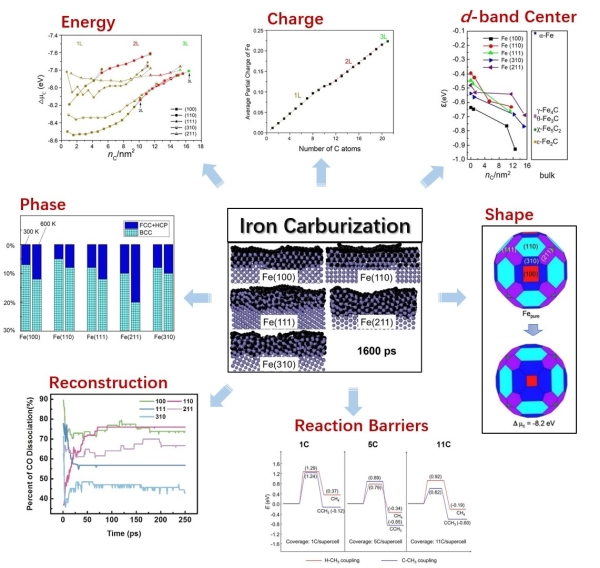 图2.Fe颗粒表面碳化导致的表面碳势、Fe原子电荷、d带中心、密堆积方式、颗粒形貌、表面重构以及表面反应能垒的变化