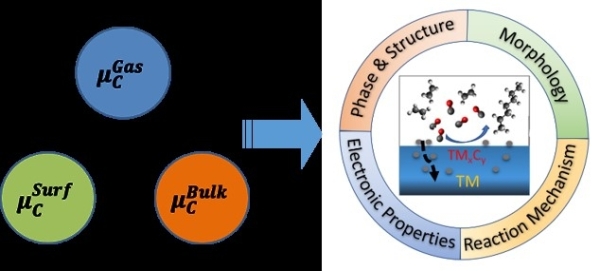 (1)碳对过渡金属物相的调控:研究人员开发了基于量子力学的结构预测方法;结合原子热力学,引入碳势描述不同反应条件(温度、压力、反应气氛)对催化剂结构的影响,建立了金属碳化物热力学相图,为实现物相可控提供了热力学理论基础和相关指导。