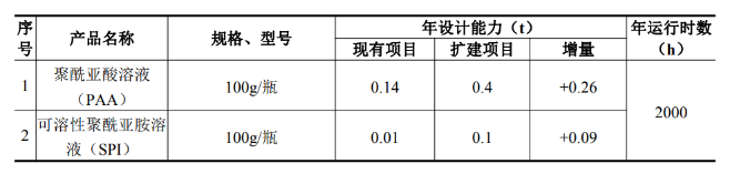 公司聚酰亚酸溶液和可溶性聚酰亚胺溶液的研发扩建项目总投560万元,扩建后产能为年产聚酰亚酸溶液(PAA)0.4 t ,可溶性聚酰亚胺溶液(SPI)0.1 t 。