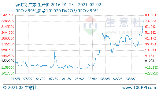 由走势图可以看出国内嫡系价格持续上涨,市场价格创5年新高,截止2日氧化镝价格为231万元/吨;镝铁合金价格为229万元/吨,金属镝价格在277.5万元/吨,国内铽系价格更是达到10年新高,2日国内氧化铽价格为882.5万元/吨,金属铽价格为1102.5万元/吨。