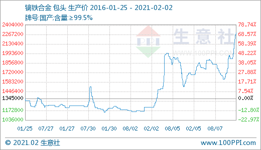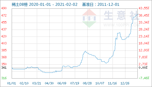 据生意社监测显示国内稀土市场价格指数走势上涨,根据生意社稀土板块指数显示,2月1日稀土指数为473点,与昨日持平,较周期内最高点1000点(2011-12-06)下降了52.70%,较2015年09月13日最低点271点上涨了74.54%。(注:周期指2011-12-01至今)。