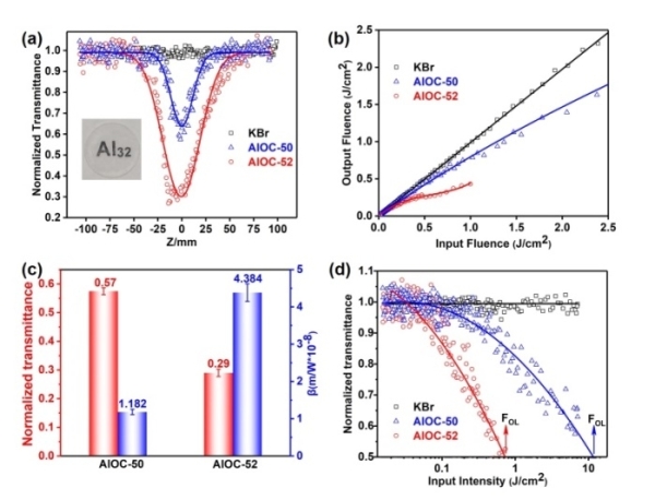 图2.三阶非线性测试结果:(a)KBr, AlOC-50, AlOC-52在532nm波长下的开孔Z扫描测试结果;(b)输出能流与输入能流变化的关系曲线;(c)非线性透过率以及非线性吸收系数;(d)透过率随输入能流的变化曲线