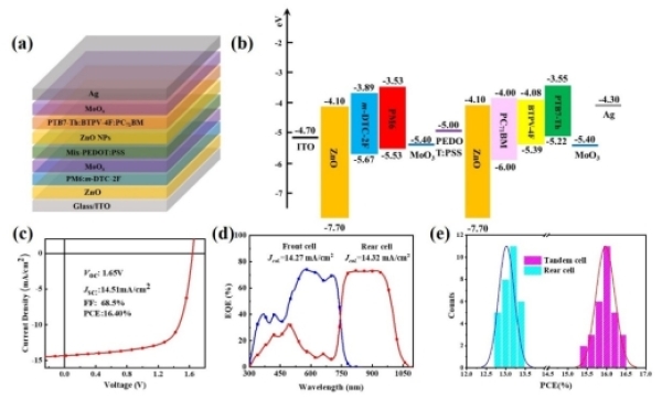 基于BTPV-4F在光学吸收和光伏性能方面展现出的优势,科研人员使用BTPV-4F为后结器件的受体构建了叠层OSC。根据理论模拟(图1c)、设计并合成了用于前结器件的带隙为1.6 eV的中等带隙受体m-DTC-2F(图1d)。使用PM6:m-DTC-2F作为前结器件活性层,以PTB7-Th:BTPV-4F:PC71BM作为后结器件活性层构建了叠层OSC。该叠层OSC表现出对300~1050 nm范围整个可见-近红外区太阳光谱的有效利用,且两个子电池实现了相对低的电压损失,开路电压达1.65 V,光电转化效率达到16.4%(图2)。此外,基于BTPV-4F的OSC表现出优秀的光稳定性,在太阳光模拟器下光照500小时后,PCE值仍可保留至最初的91%。