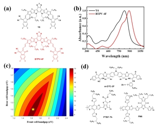 图1.(a)受体BTPV-4F和Y6的分子结构(b)BTPV-4F和Y6薄膜的吸收光谱(c)模拟的叠层OSC前后结器件活性层的能带隙匹配(d)受体m-DTC-2F以及聚合物给体PTB7-Th和PM6的分子结构