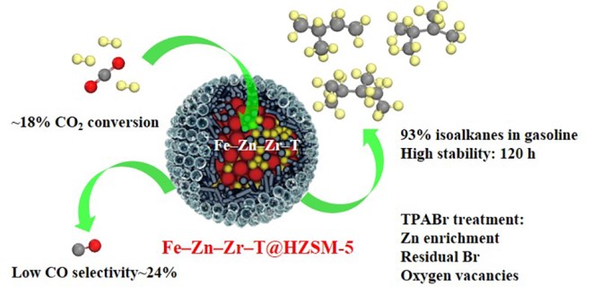 基于早期在CO2加氢制异构烷烃方面研究工作的积累,科研人员根据CO2加氢制烃多步串联反应的特点,采用简单的制备方法将HZSM-5分子筛均匀包覆于Fe-Zn-Zr金属氧化物表面,制备出核壳结构催化剂,通过强化分子筛的空间限域控制中间产物的转化,实现了异构烷烃及高品质汽油的选择性合成(Chemical Communications, 2016, 52, 7352–7355; Catalysis Science & Technology, 2019, 9, 5401–5412),并获授权国家发明专利1项。在此基础上,通过对复合金属氧化物进行高温水热处理(如图),实现了CO2加氢到高品质汽油的选择性转化,汽油烃中异构烷烃的选择性高达93%以上,同时可将副产物CO抑制到24%。