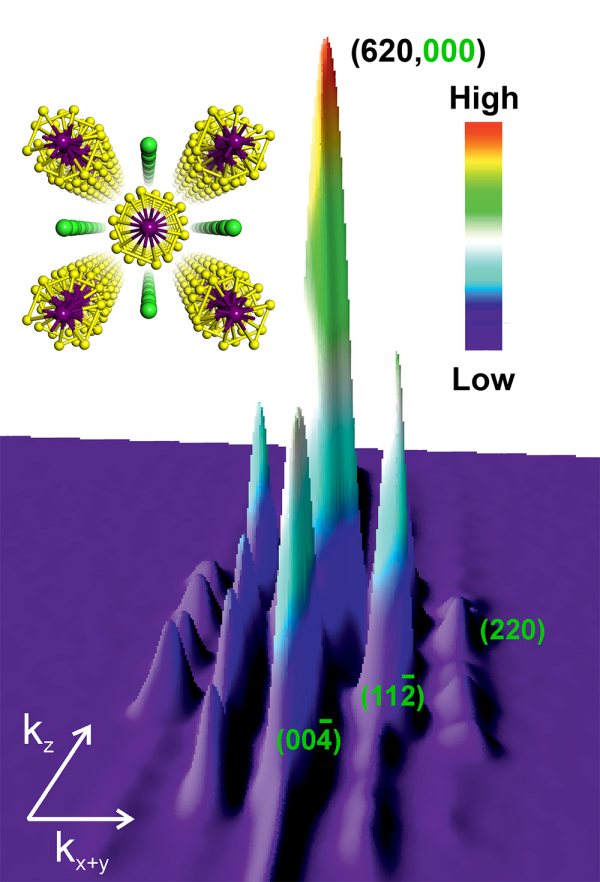图1.X射线衍射强度图,显示着由电荷密度波导致的(620)衍射峰附近的小卫星峰。插图为准一维材料(TaSe4)2I的晶体结构。