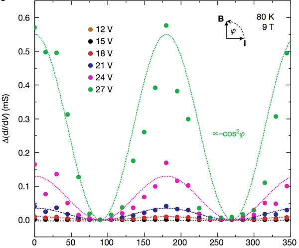 图2.测量的 Δ(dI/dV)数据与E和B之间夹角存在近似平方余弦函数的关系