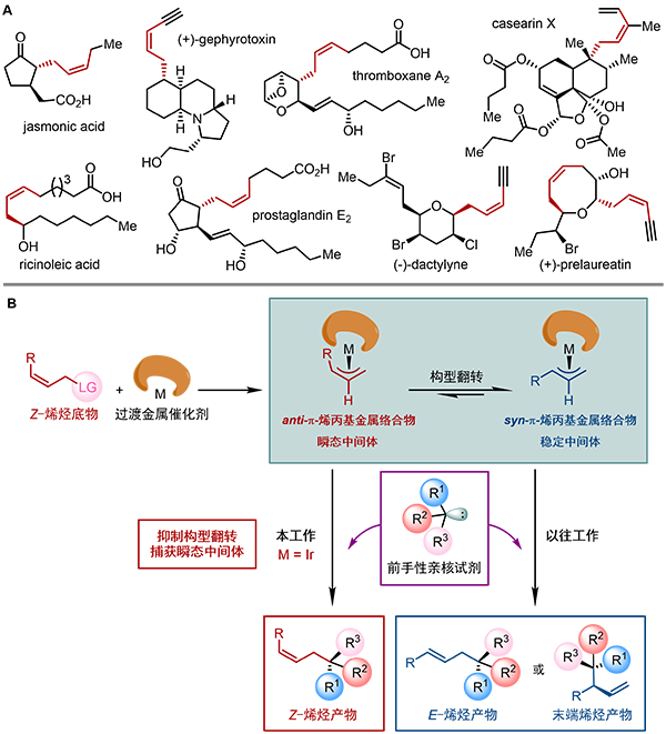 图1.(A)含有Z-烯烃的手性天然产物和生物活性分子;(B)过渡金属催化不对称烯丙基取代反应