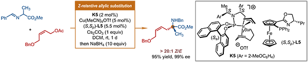图4.铱催化α-氨基酸衍生物的Z式保留不对称烯丙基取代反应