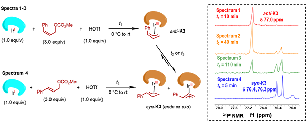 在进一步的机理研究中,研究人员通过核磁共振磷谱(31P NMR)和质谱实验,观察到在三氟甲磺酸的促进下,一价铱物种可与Z-烯丙基前体发生氧化加成生成anti-π-烯丙基铱络合物;该络合物在室温下可逐渐异构化为热力学稳定的syn-π-烯丙基铱络合物(图3)。此外,若向含有anti-π-烯丙基铱络合物的反应体系中加入亲核试剂,该物种的磷谱和质谱信号均会立即消失,同时质谱上可监测到产物信号。这进一步证实了π-烯丙基铱络合物接受亲核试剂进攻的速率远大于其异构化速率,即anti-π-烯丙基铱络合物异构化为syn-π-烯丙基铱络合物之前便可被亲核试剂捕获,生成含有Z-烯烃的手性产物。