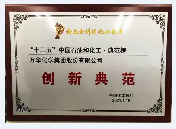 1月16日,由中国石油和化学工业联合会指导、中国化工报社主办的2020年度中国石油和化工行业十大新闻暨影响力人物发布盛典线上举行。盛典发布了“十三五”中国石油和化工•典范榜,万华化学集团股份有限公司获评创新典范。
