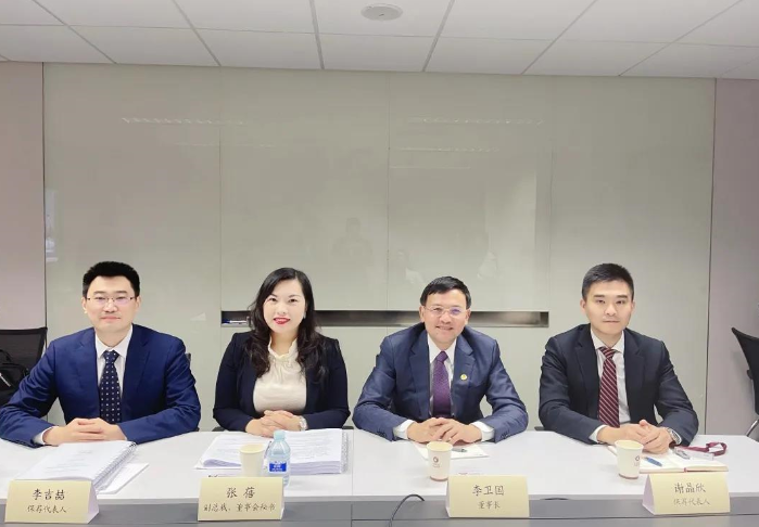 从左至右:中金公司投资银行部副总经理李吉喆,东方雨虹副总裁、董事会秘书张蓓,东方雨虹董事长李卫国,中金公司投资银行部执行总经理谢晶欣