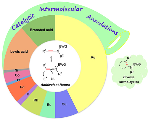 炔酰胺是一类特殊的功能化炔烃化合物。炔酰胺的碳碳三键直接与氮原子相连,极大增强了炔的活性,同时氮原子上还连有吸电子基,使得反应具有良好的稳定性。由于这种独特的结构,炔酰胺同时具有亲电和亲核两种性质。基于此,催化炔酰胺的分子间环加成反应已成为精准构筑各类氨基杂环的通用方法。该综述回顾了过去十年该领域的研究进展,按照过渡金属和酸催化体系,对已有分子间环加成反应类型进行了系统的总结与评述,并展望了今后的研究重点。