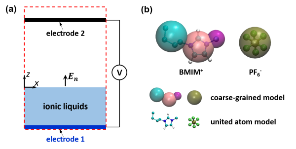 图1 (左)分子动力学模拟系统示意图,(右)离子液体[BMIM][PF6]的计算模型