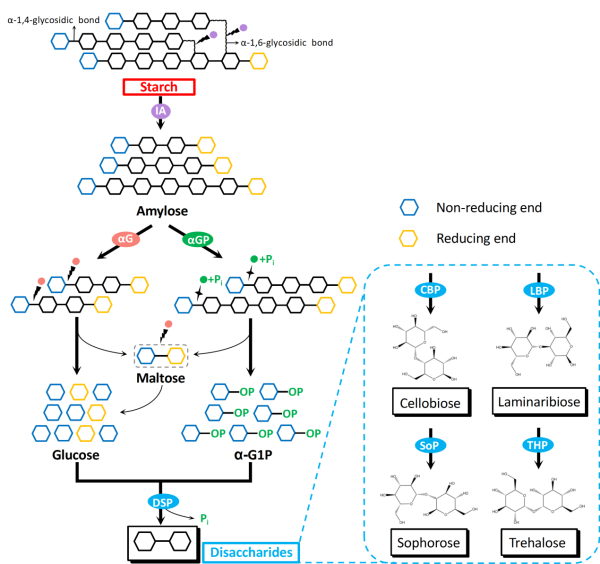 中国科学院天津工业生物技术研究所研究员游淳带领的体外合成生物学中心研究团队,设计了将廉价底物淀粉转化为多种功能性二糖的体外多酶催化体系。在该体系中,α-葡聚糖磷酸化酶(α-glucan phosphorylase, αGP)和α-葡萄糖苷酶(α-glucosidase, αG)两种酶并行工作,将淀粉分别转化为葡萄糖1-磷酸和葡萄糖,随后葡萄糖1-磷酸和葡萄糖经不同的二糖磷酸化酶(disaccharide phosphorylase, DSP)催化合成各种功能性二糖。该研究利用动力学数学模型对体外多酶催化体系的反应进程进行学习并预测最佳反应条件,以淀粉为单一底物制备出昆布二糖、纤维二糖、海藻糖、槐糖等功能性二糖,产率均在80%以上。该研究中的功能性二糖的生产方式改变了现有二糖的传统生产模式,具有较大的工业应用潜力。